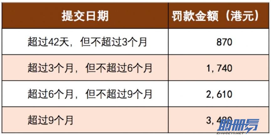 1.如上圖所示,公司逾期提交周年申報(bào)超過(guò)42天3個(gè)月,會(huì)被罰款870元,以后逾期時(shí)間每增加3個(gè)月,罰款累計(jì)增加870元,逾期超過(guò)9個(gè)月以上還會(huì)被起訴。